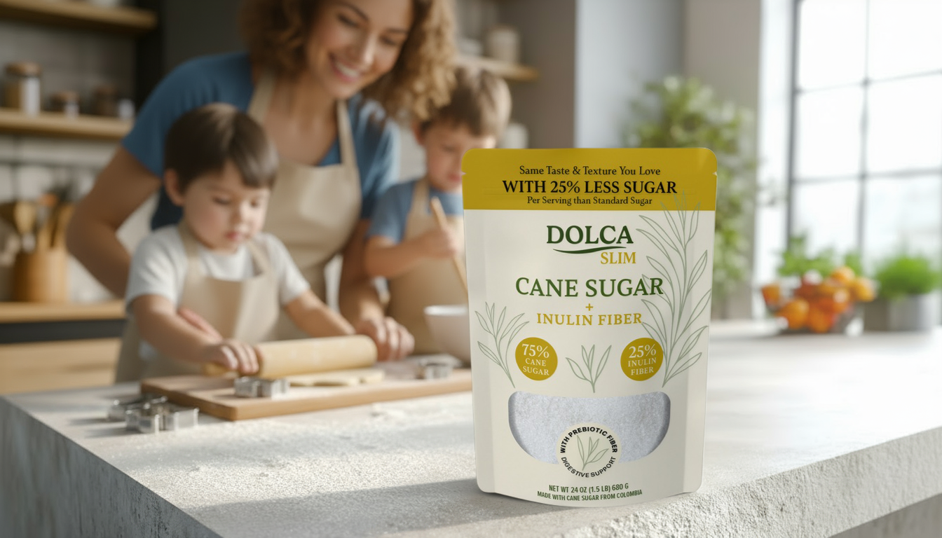 Dolca Slim is a clean-label blend of 75% cane sugar + 255 soluble fiber designed to sweeten 1:1 like regular sugar—with ~25% less sugar per serving.