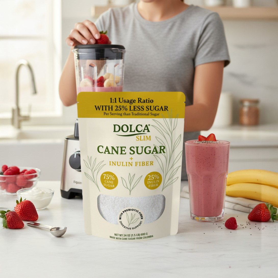 Dolca Slim is a clean-label blend of 75% cane sugar + 255 soluble fiber designed to sweeten 1:1 like regular sugar—with ~25% less sugar per serving.