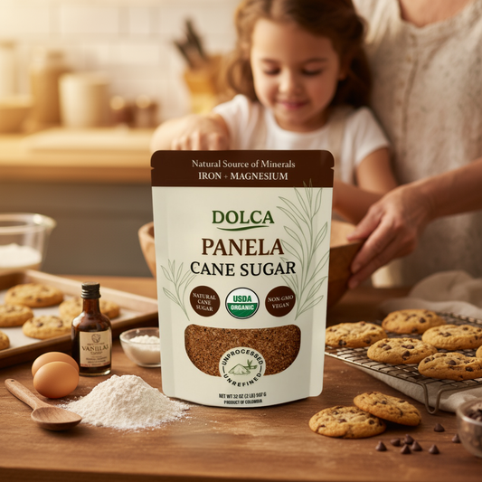 Dolca Panela is our unrefined, cane sugar—the traditional “whole cane” sweetener known as panela / piloncillo / papelónin Latin America.