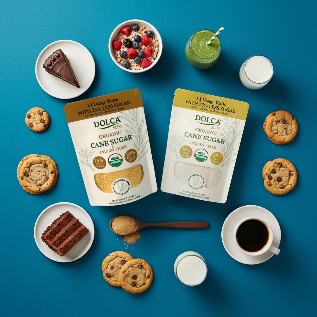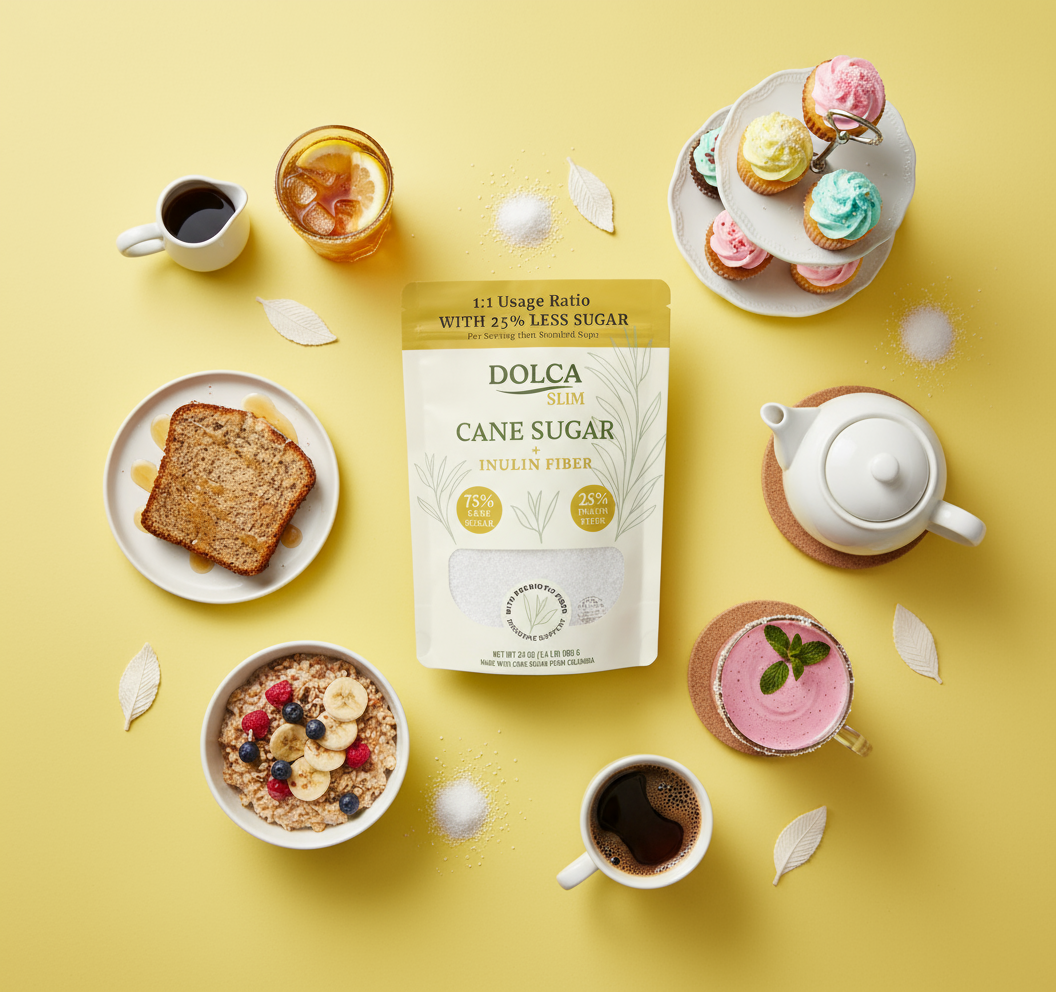 - Dolca Slim (Original) — Cane sugar + 25% soluble fiber. 1:1 usage, 25% less sugar per serving, classic sugar taste, no aftertaste, no fillers.