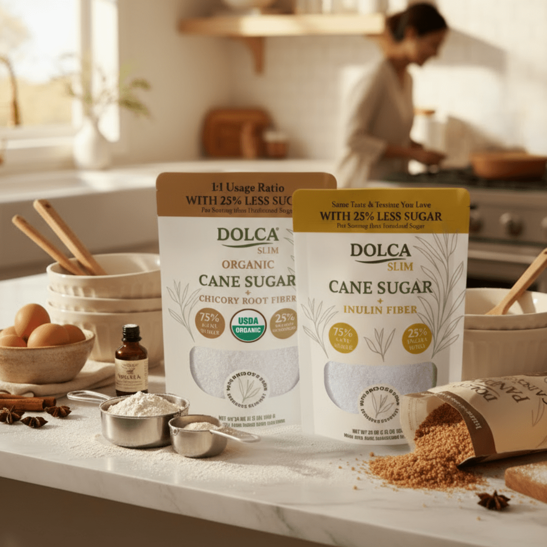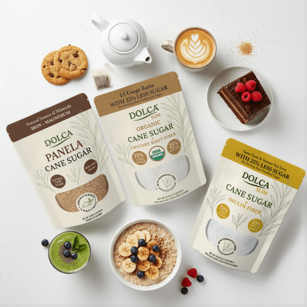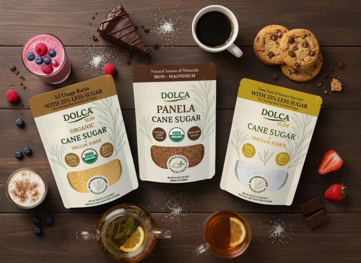 Dolca makes healthy sugar for real life—starting with Dolca Slim (cane sugar + 25% soluble fiber) and our unrefined Dolca Panela. We keep what matters (taste, texture) and skip what doesn’t (chemical sweeteners, fillers).