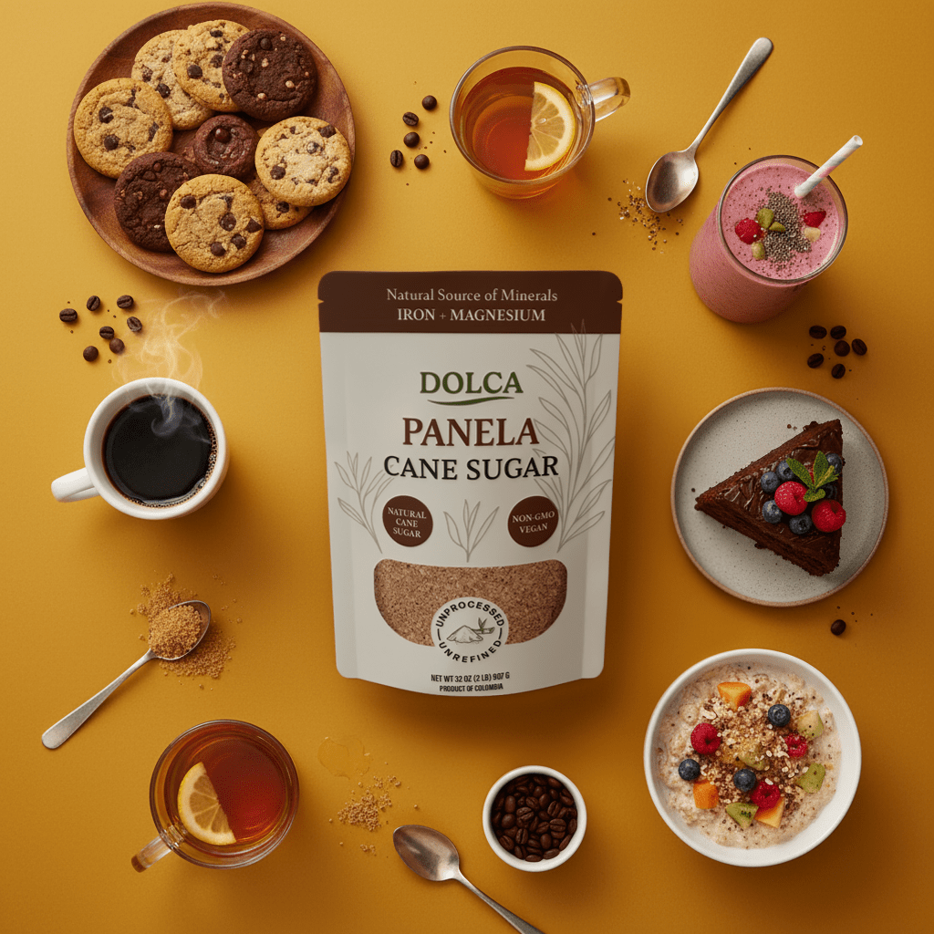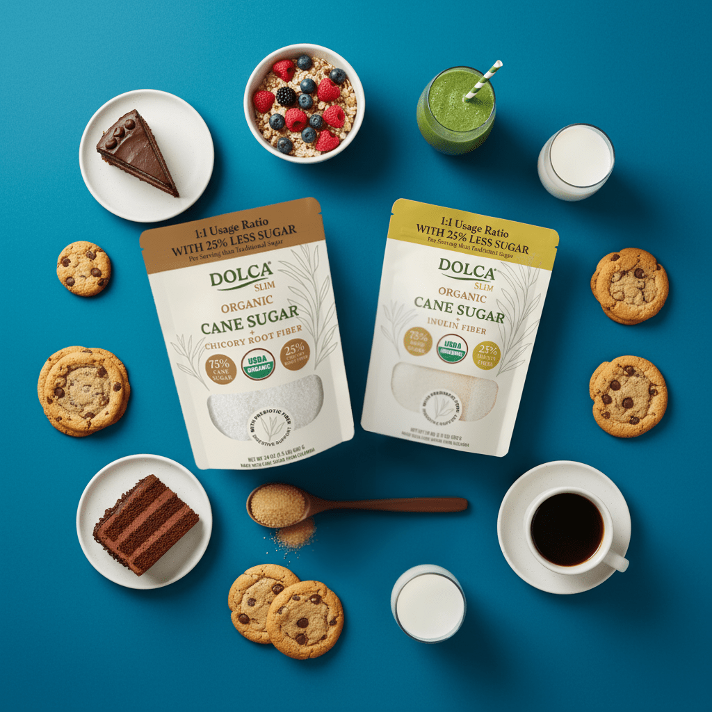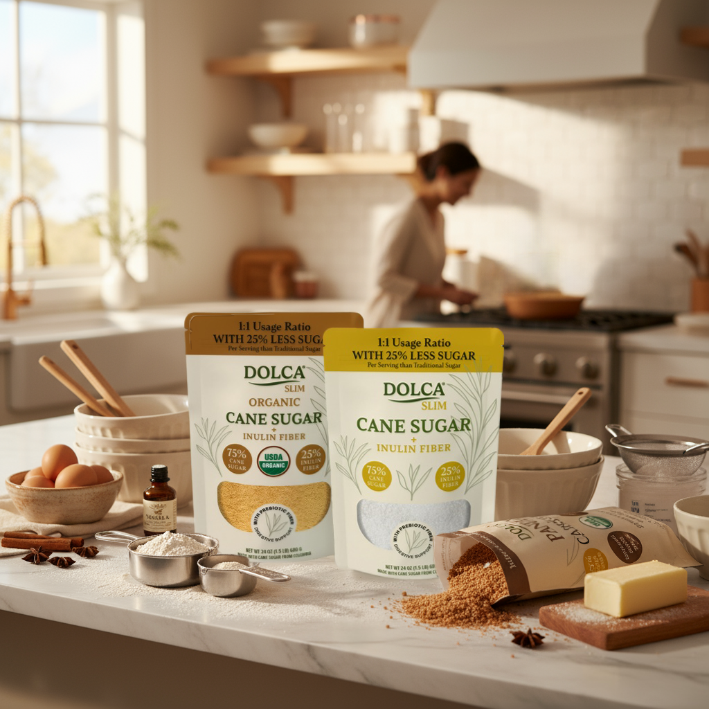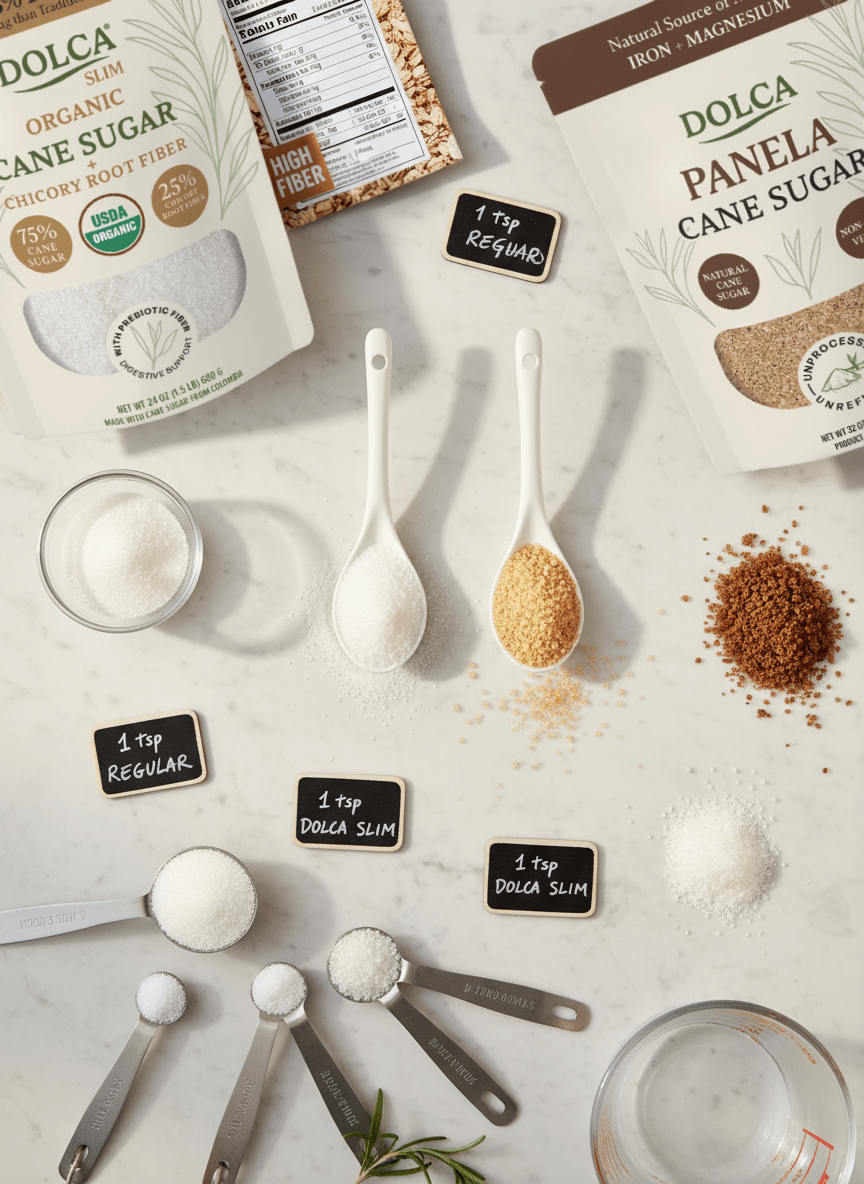 Dolca makes healthy sugar for real life—starting with Dolca Slim (cane sugar + 25% soluble fiber) and our unrefined Dolca Panela. We keep what matters (taste, texture) and skip what doesn’t (chemical sweeteners, fillers).