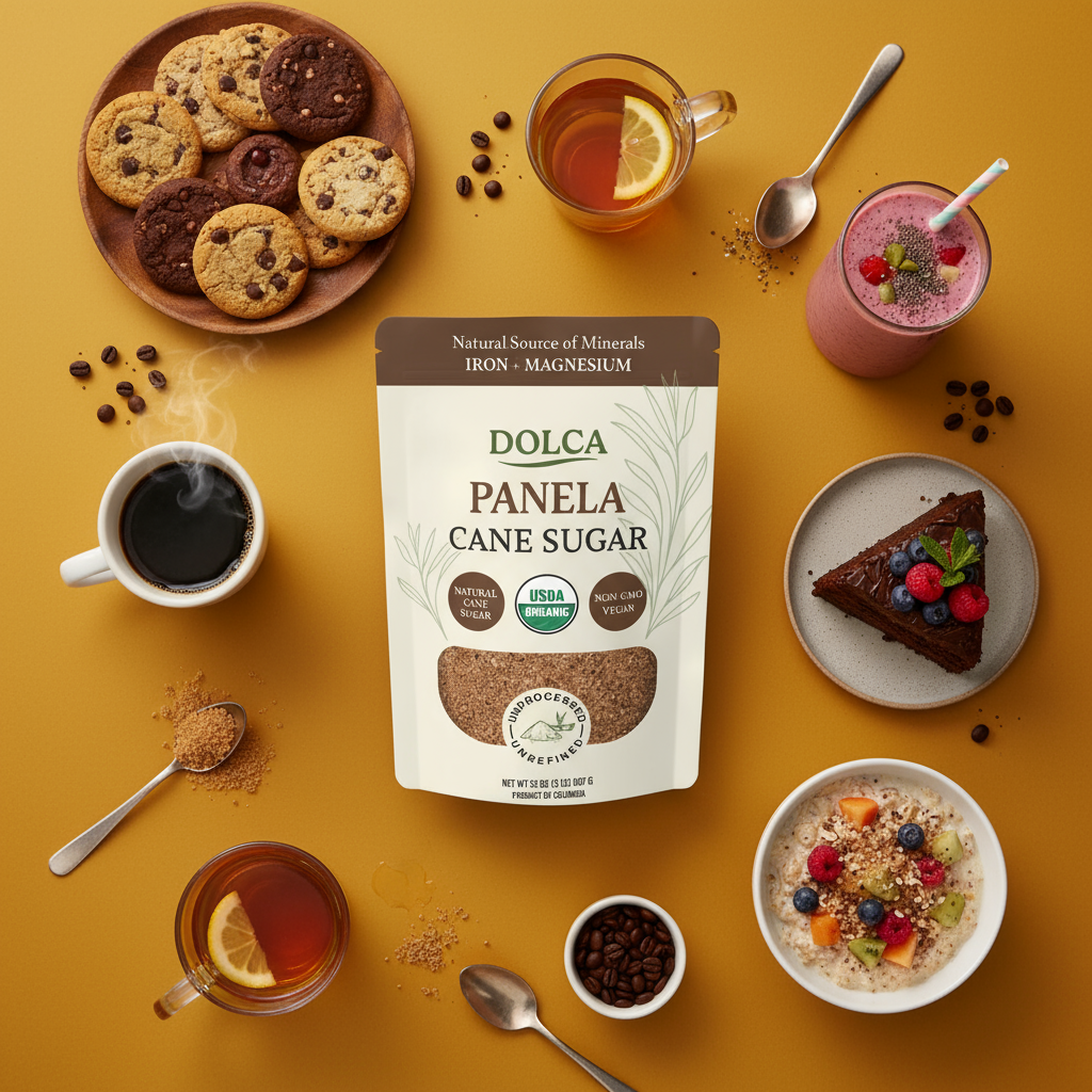 - Dolca Panela (Granulated Panela) — Unrefined, non-centrifugal cane sugar with warm caramel notes. Minimally processed to retain natural cane molasses and trace minerals—like iron and magnesium.* Perfect for coffee, tea, baking, and traditional recipes.